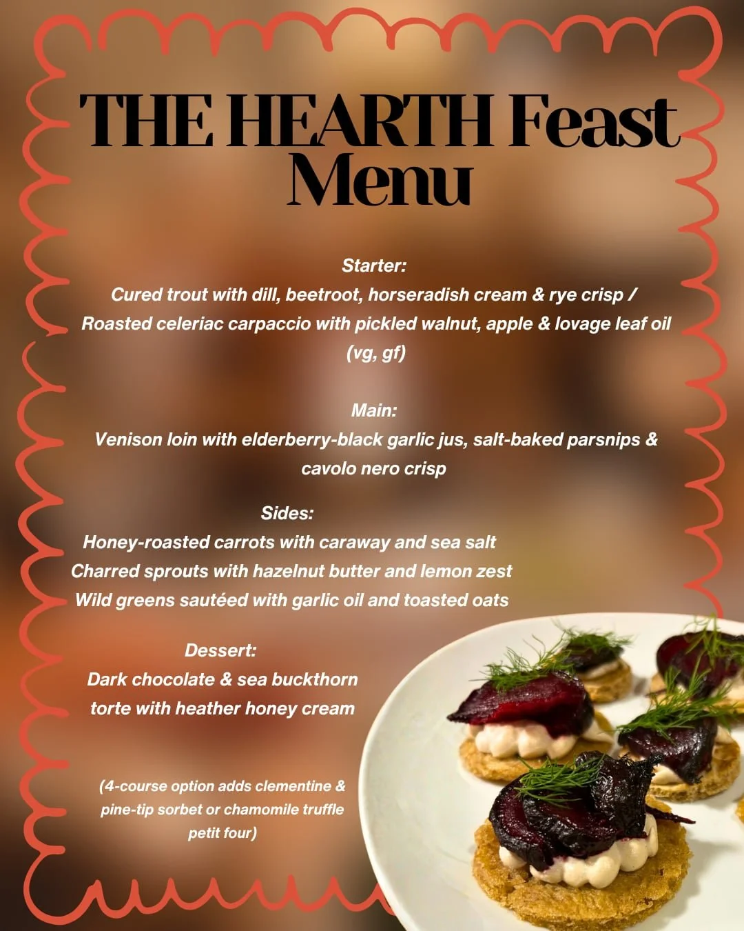 A candle-lit celebration of winter’s richness — fine local meats, smoke, butter & amber sweetness.